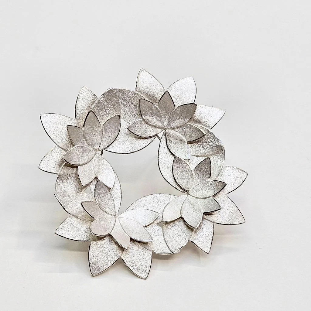 Like most of my pieces, this brooch is handmade by fusing recycled sterling silver sheet petals together to create a floral motif. I love the impact that repetitive elements can make in a piece, so I have riveted four floral elements to the front.